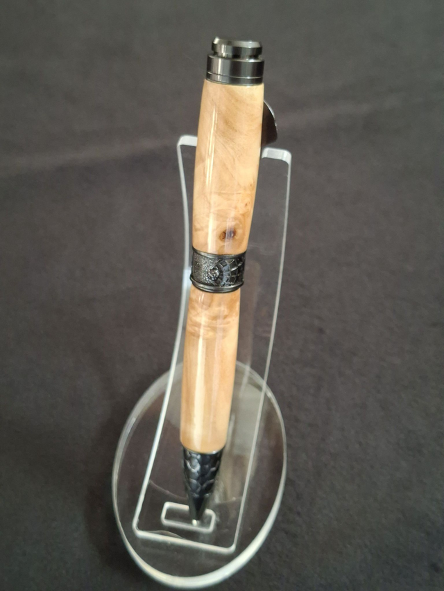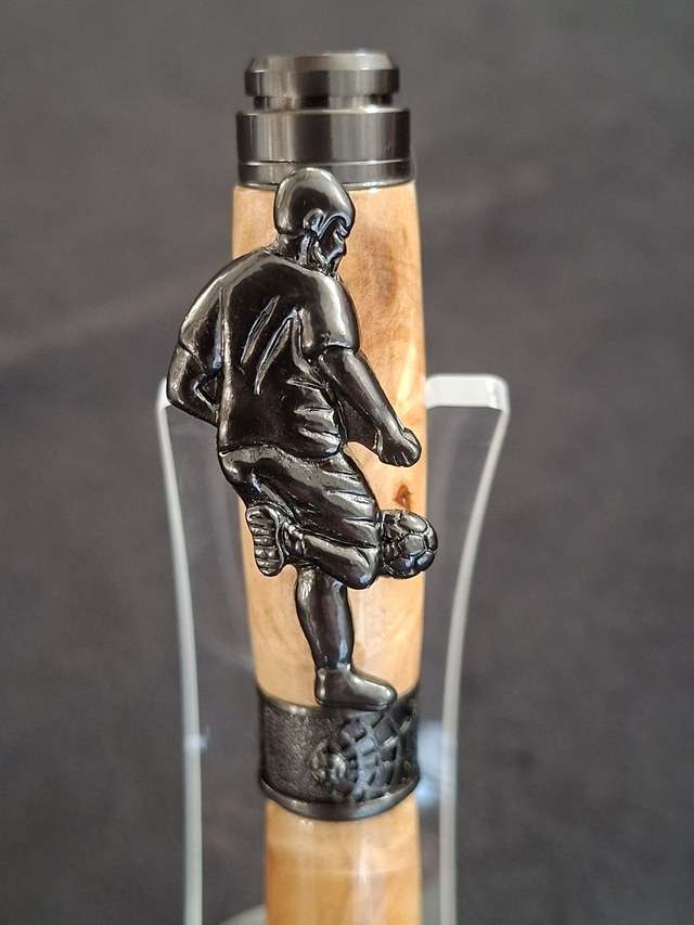Stylo bille rotatif sur le thème du football. Divers éléments sur ce sport sont représentés sur le mécanisme, notamment un jouer en position de tir sur la barrette.