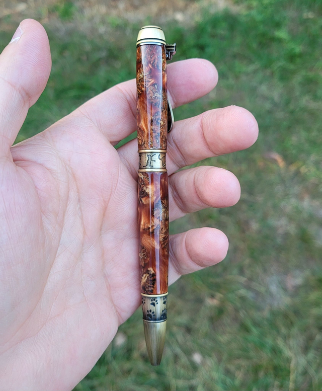Stylo Kitten bronze en résine cuivrée avec cônes d'aulne