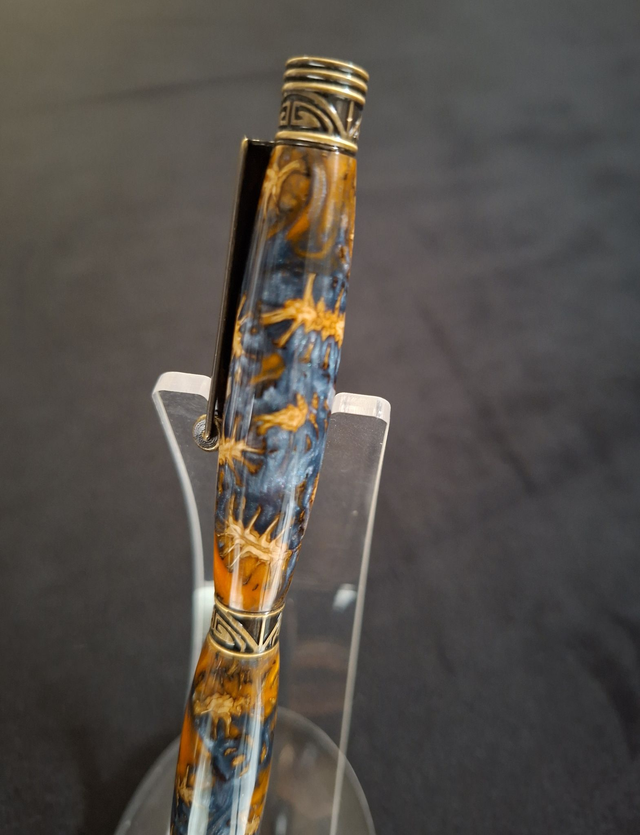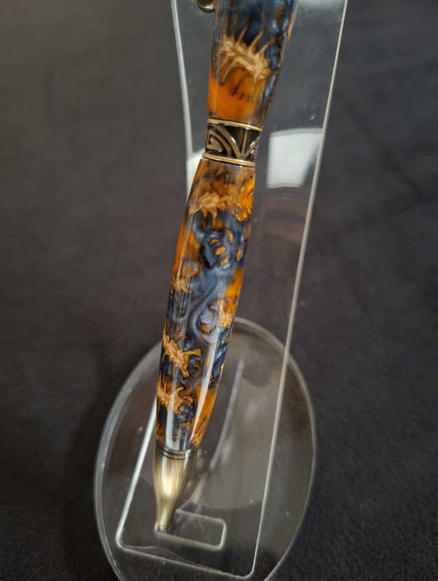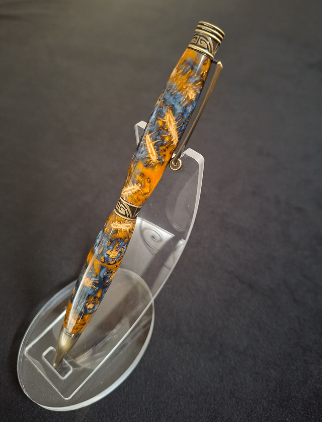 Stylo Arabesque bronze en résine orange et grise bleutée avec cônes d'aulne
