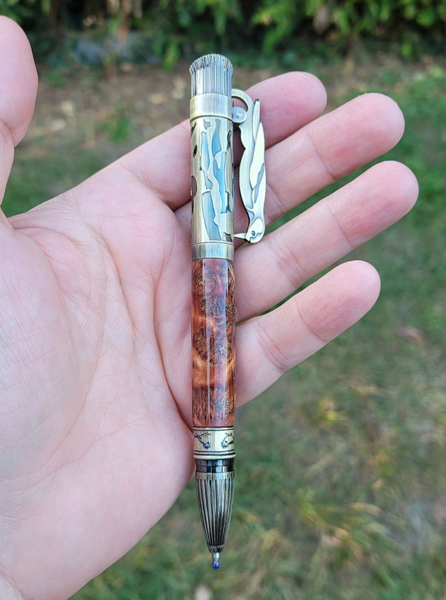 Stylo Bird en cônes d'aulne stabilisées dans une résine cuivrée.